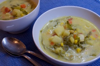 Fry the onion for 5 minutes until soft. Add the curry paste and stir over a high heat to cook the paste. Add the carrot, potato, bay leaf, stock and milk and simmer for about 15 minutes or until the potato and carrot are almost cooked, still a little bit firm in the centre. Add the corn and haddock. If you're adding some greens, add tougher ones now, or softer ones like spinach right at the end. Simmer for 10 minutes, and taste for seasoning. Smoked haddock varies in saltiness so you may not need to add much, if any, salt. Add more milk or stock if the soup seems too thick, and season to taste.