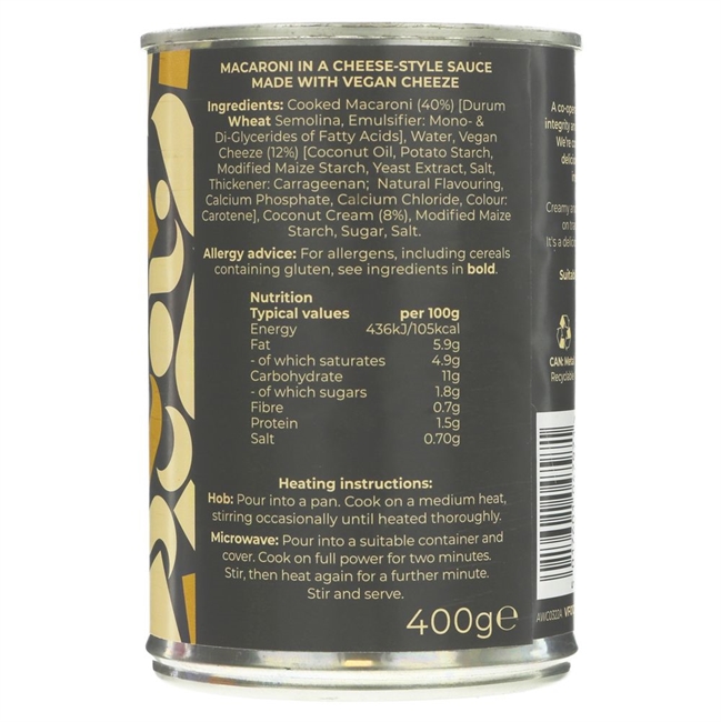 Cooked macaroni (40%) [durum wheat semolina, emulsifier: mono- & di-glycerides of fatty acids], water, vegan cheese (12%) [coconut oil, potato starch, modified maize starch, yeast extract, salt, thickener: carrageenan; natural flavouring, calcium phosphate, calcium chloride, colour: carotene], coconut cream (8%), modified maize starch, sugar, salt.