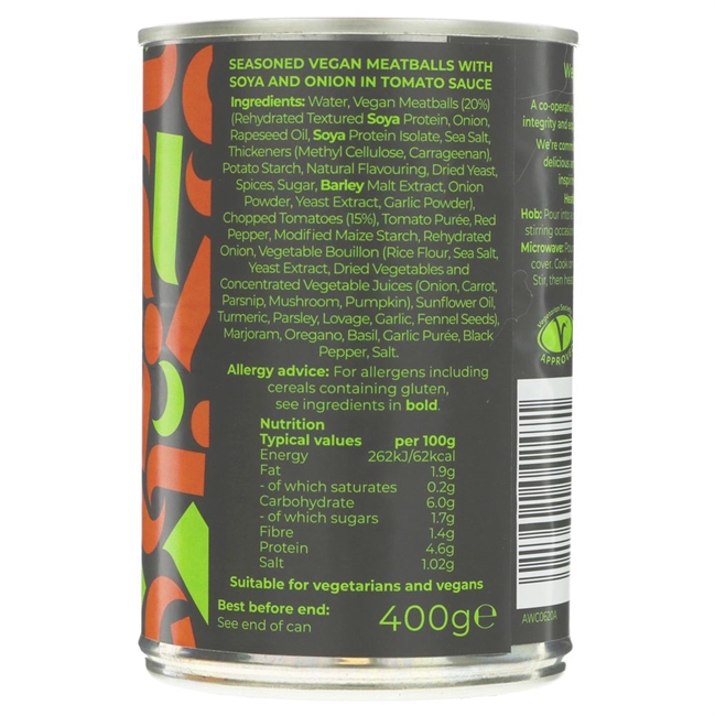 Water, vegan meatballs (20%) [rehydrated textured soya protein (14%), onion, rapeseed oil, soya protein isolate, sea salt, thickeners: methyl cellulose, carrageenan; potato starch, natural flavouring, dried yeast, spices, sugar, barley malt extract, onion powder, yeast extract, garlic powder], chopped tomatoes (15%) , tomato puree, red pepper, modified maize starch, rehydrated onion, vegetable bouillon (rice flour, sea salt, yeast extract, dried vegetables and concentrated vegetable juices [onion, carrot, parsnip, mushroom, pumpkin], sunflower oil, turmeric, parsley, lovage, garlic, fennel seeds), marjoram, oregano, basil, garlic puree, black pepper, salt.