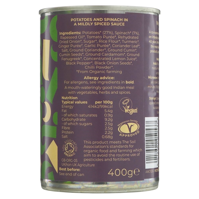 Potatoes* (27%) (potatoes*, spinach* (7%), rapeseed oil*, tomato puree*, rehydrated dried onion*, sugar*, rice flour*, turmeric*, ginger puree*, garlic puree*, coriander leaf*, salt*, ground coriander*, ground cumin*, cumin seeds*, ground cardamom*, ground fenugreek*, concentrated lemon juice*, black pepper*, black onion seeds*, chilli powder*. *from organic farming