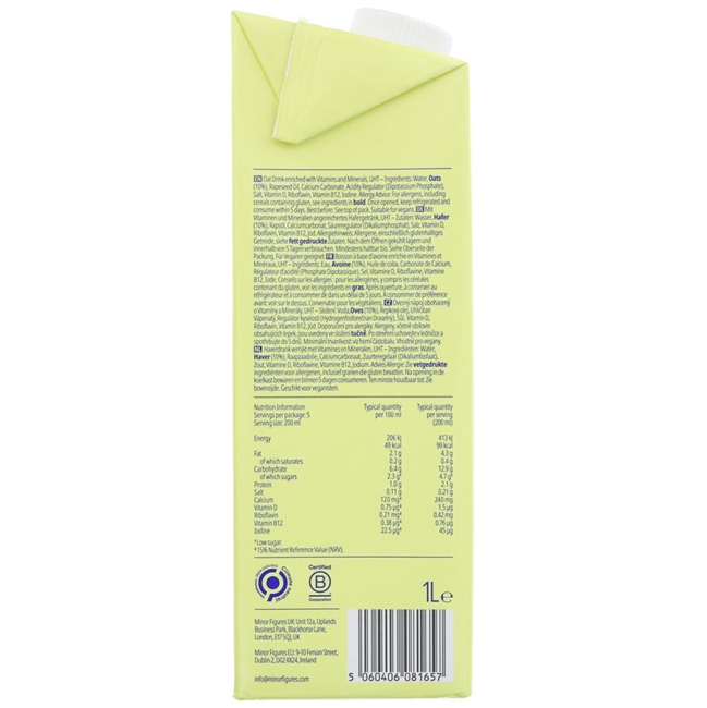Water, oats (10%), rapeseed oil, calcium carbonate, acidity regulator(dipotassium phosphate), salt, vitamin d, riboflavin, vitamin b12, iodine.