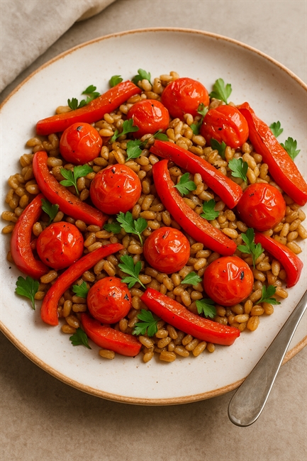 Fold the roasted vegetables through the warm grains, drizzle with olive oil, and season to taste. Garnish with chopped herbs or a squeeze of lemon.
