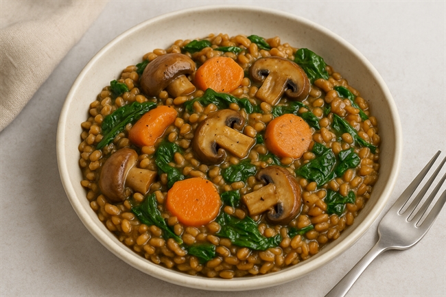 A wholesome twist on the classic risotto, made with nutty Flanders wholegrain wheat instead of rice. Packed with locally grown Suffolk carrots, chestnut mushrooms, and tender perpetual spinach, this dish delivers deep flavour and hearty texture — a perfect seasonal comfort meal that celebrates British produce.