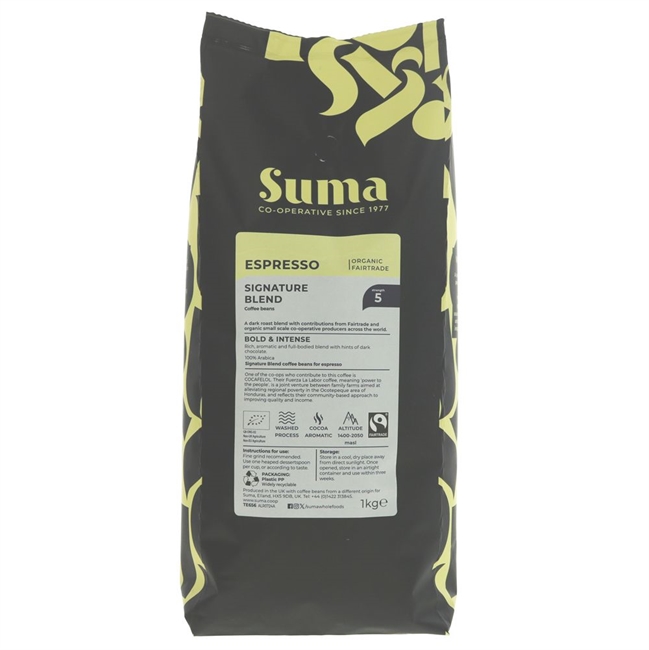 Suma's dark roast signature espresso blend with contributions from Fairtrade and organic small-scale co-operative producers across the world. One of the co-ops who contribute to this coffee is COCAFELOL. Their Fuerza La Labor coffee, meaning 'power to the people', is a joint venture between family farms aimed at alleviating regional poverty in the Ocotepeque area of Honduras, and reflects their community-based approach to improving quality and income.