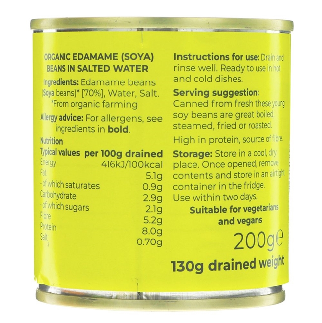 Canned from fresh these young soy beans are great boiled, steamed, fried or roasted. A good source of protein and fibre. Part of the product range 'Canned from Fresh'