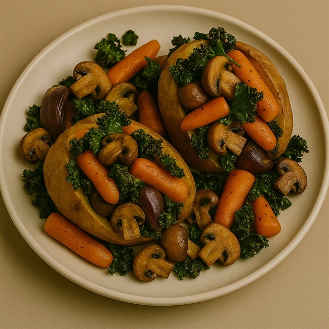 Split the baked potatoes open and pile the roasted mushrooms, carrots, onions and crispy kale generously on top.