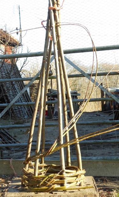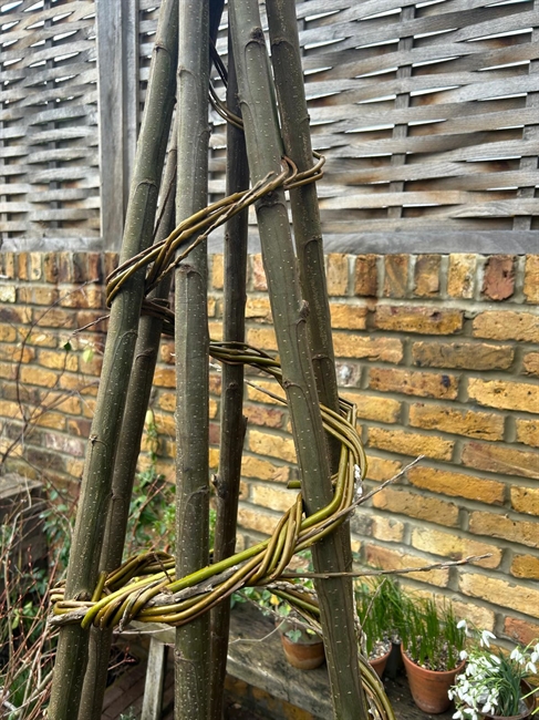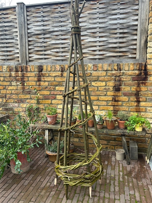 Each teepee is made by hand by local maker Karen Kelsey in Pulborough, using strong British chestnut stakes bound with freshly woven willow. The chestnut provides long-lasting structure, while the willow is wrapped in a generous spiral that climbing plants can naturally grip and wind around as they grow.