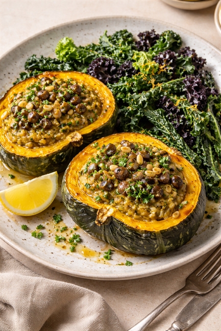 Place the stuffed squash halves on plates and serve with a generous pile of lemony winter kale alongside.