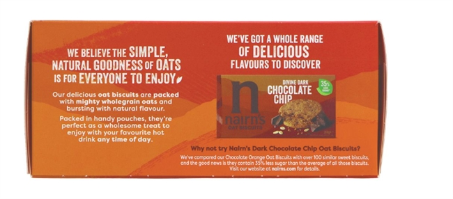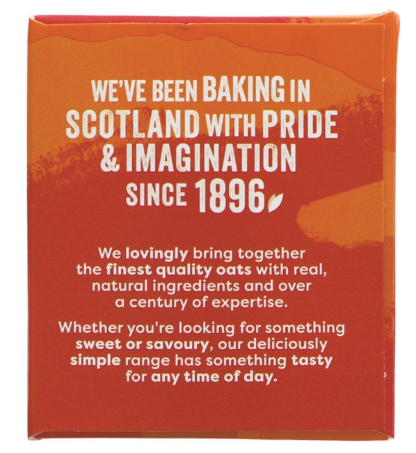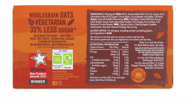 Wholegrain oats (61%), sustainable palm fruit oil, sugar, dark chocolate chips (5%)(sugar, cocoa mass, cocoa butter, emulsifier: lecithins (soya), natural vanilla flavouring, milk), partially inverted refiners syrup; lyles golden syrup, dark chocolate powder (4%)(sugar, cocoa mass, fat reduced cocoa powder, milk), tapioca starch, raising agent: sodium carbonates, sea salt, natural orange flavouring.