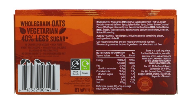 Wholegrain oats (65%), sustainable palm fruit oil, sugar, partially inverted refiners syrup; lyles golden syrup, salted butter caramel pieces (3%) (sugar, glucose syrup, sweetened condensed milk, salted butter (milk), water), tapioca starch, raising agent: sodium bicarbonate, sea salt, natural flavouring.