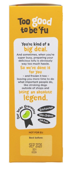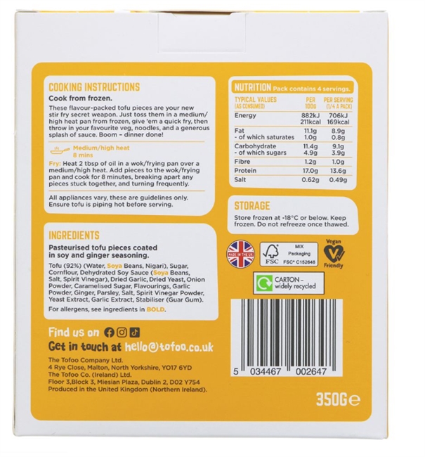 Tofu (92%) (water, soya beans, nigari), sugar, maize starch, dehydrated soy sauce (soya beans, salt, spirit vinegar), dried yeast, onion powder, caramelised sugar, flavourings, garlic powder, ginger, parsley, salt, spitir vinegar powder, yeast extract, garlic extract, stabiliser (guar gum)