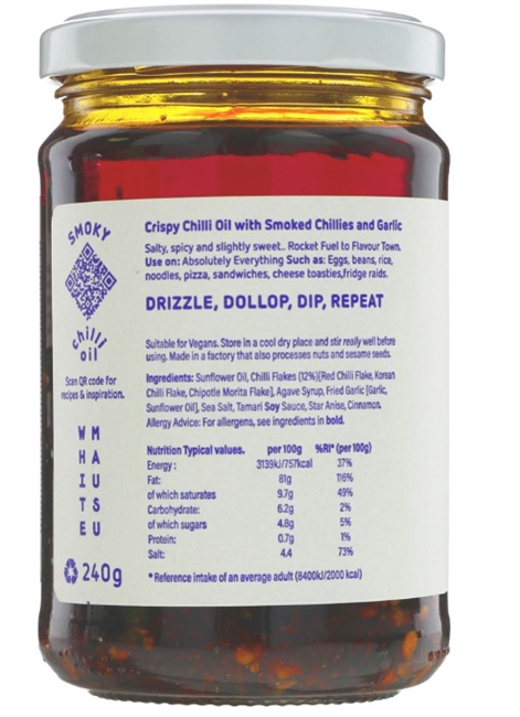 Sunflower oil, chilli flakes (12%) [red chilli flake, korean chilli flake, chipotle morita flake], agave syrup, fried garlic [garlic, sunflower oil], sea salt, tamari soy sauce, star anise, cinnamon.