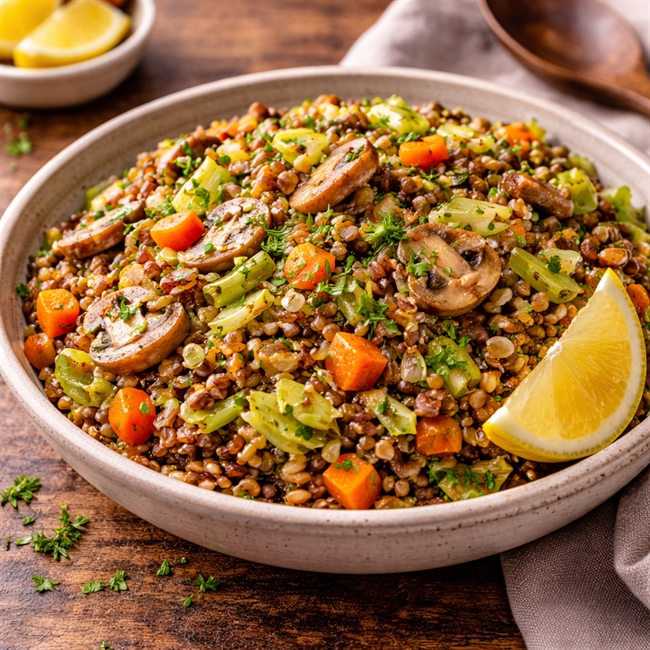 If you'd like, I can also generate the matching “ingredient chopping board” image for this recipe (black wheat, onion, carrots, herbs etc.), consistent with the other recipe box visuals you're building.