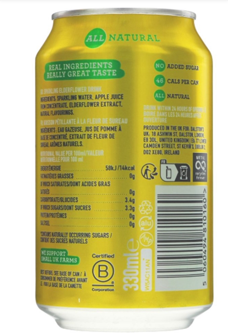Flower power in a can. Made with British elderflower and sweetened with apples, it's basically the Wild Isles in a can. Side effects may include urges to frolic in fields. No added sugar, no sweeteners and no artificial ingredients, it's the skill of our chefs and the quality of our fruit that gives this fizz its fresh, crisp flavour and light, floral aroma.