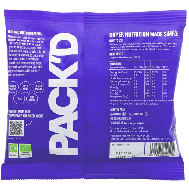Hand-picked organic frozen Blueberries certified by the UK soil association. We have carefully sourced the best quality Blueberries. We freeze once perfectly ripe to lock in flavour. Perfect for home-made smoothies, breakfast, baking and healthy snacks.